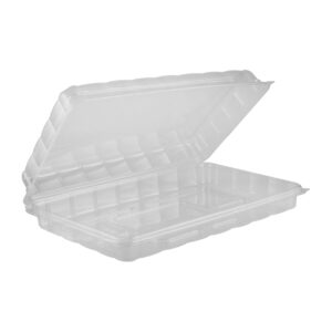 Wide variety of one-piece hinged clear bases and lids from 4 to 93 oz in various sizes. Crystal-clear PETE highlights the food contents in the leak-resistant Perimeter Fresh™ closure.